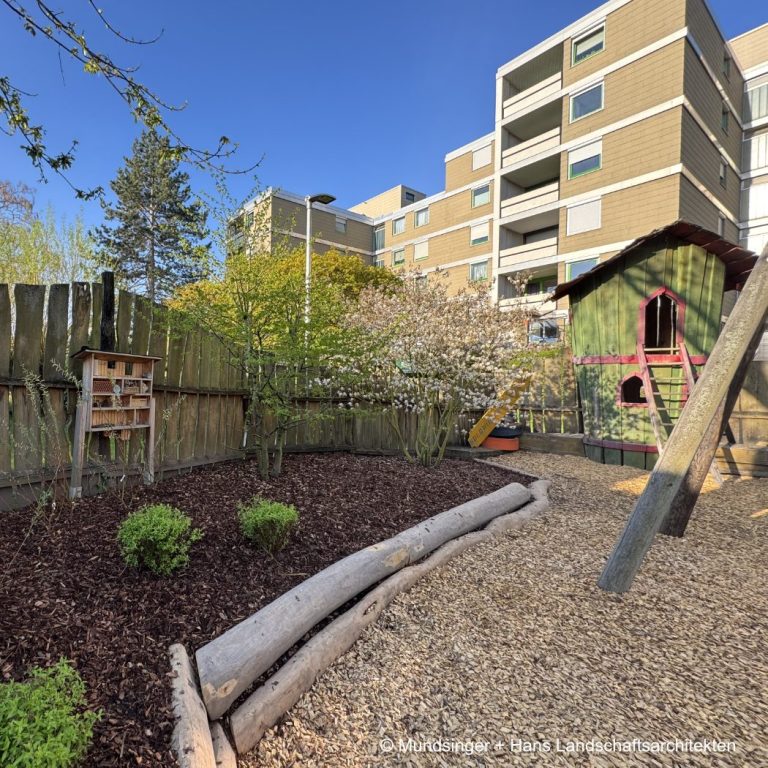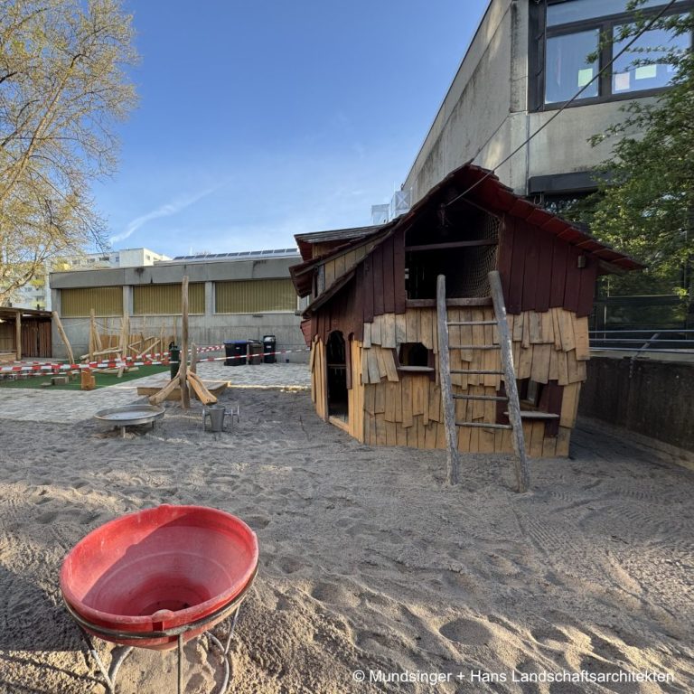 Im Bestandsgarten des Goldwiesen Kinderhauses erfolgen umfassende Ertüchtigungsmaßnahmen in den Bereichen Sonnenschutz, Spielgeräten und Wasserspielzone.