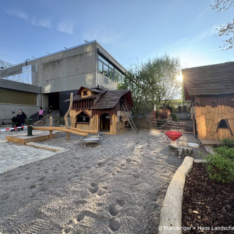 Innovative, selbstkonzipierte Kletter- und Balancierelemente werden integriert, um eine anregende Umgebung für Spiel und Bewegung zu schaffen. Zudem wird ein durchfahrbarer Tunnel aus Robinienholz errichtet, der sowohl als Rückzugsort als auch als Möglichkeit des Rollenspiels dient. Ein grüner Rahmen mit Bienennährgehölzen und Naschhecke schafft neue Szenen im Bestandsumfeld.